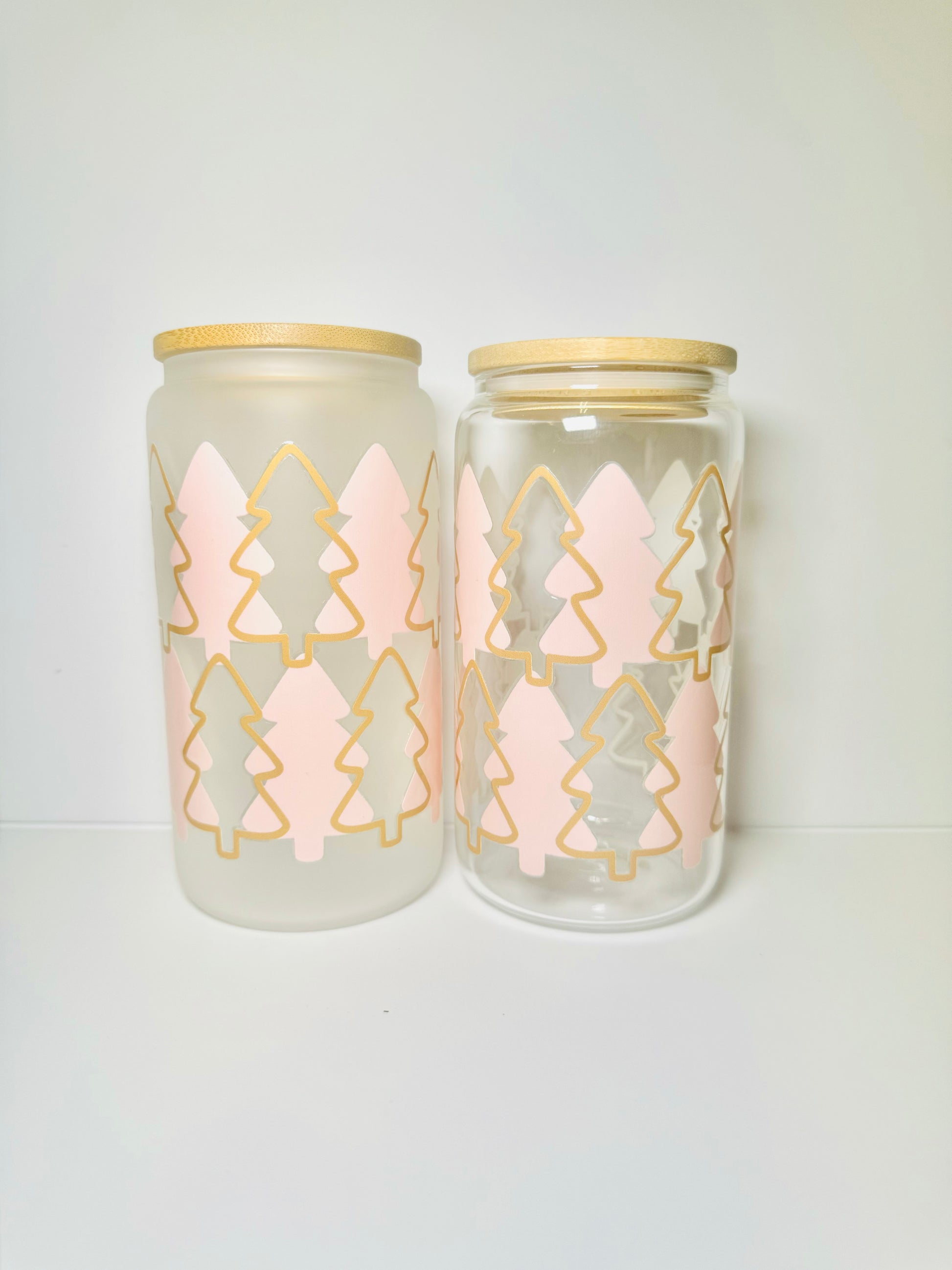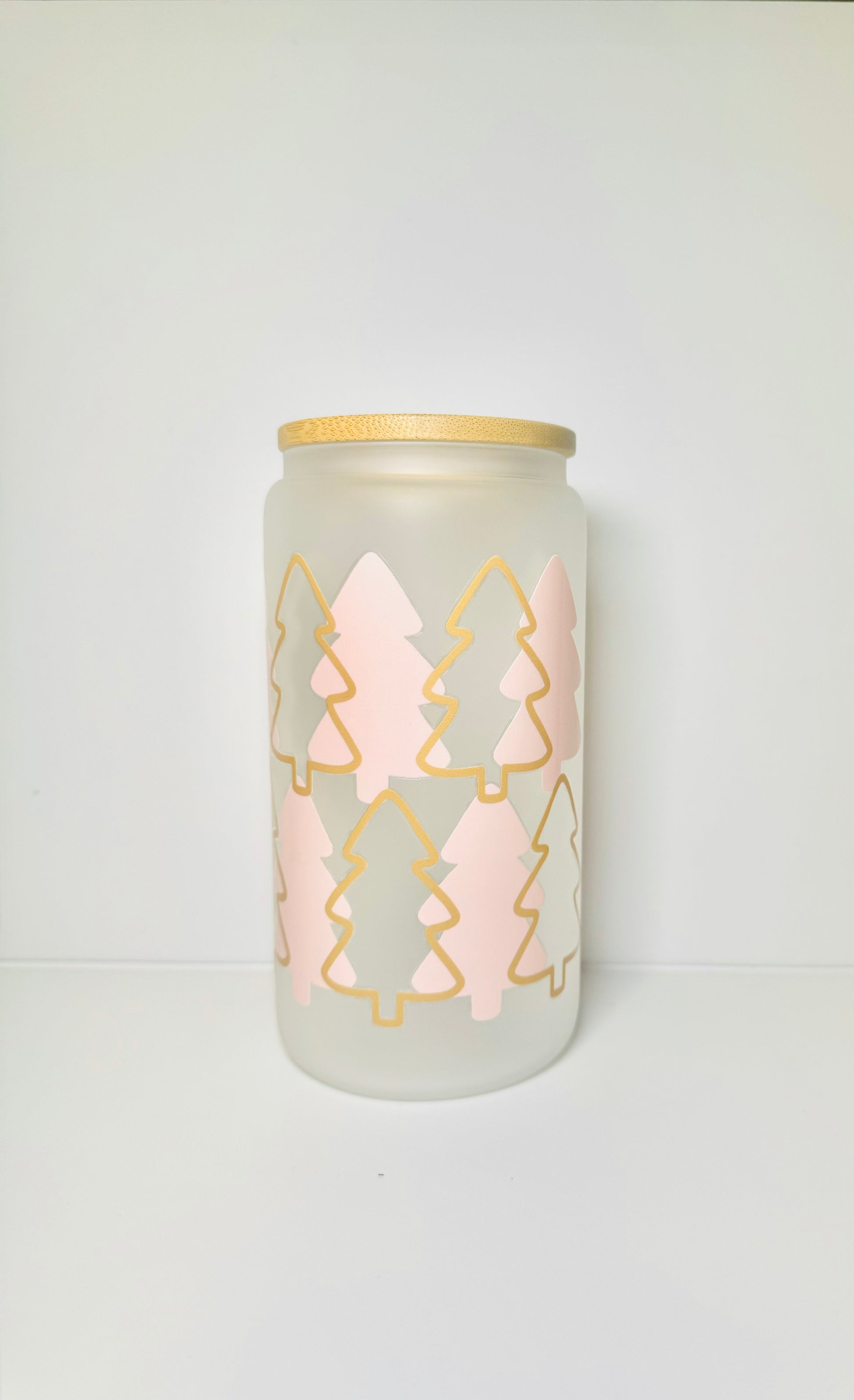 Pink Trees Christmas 16oz Glass Cup with Vibrant DTF Wrap