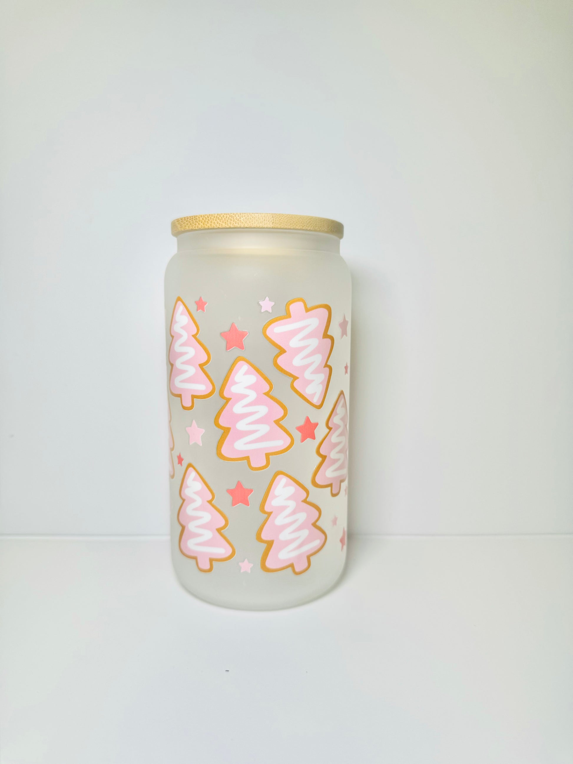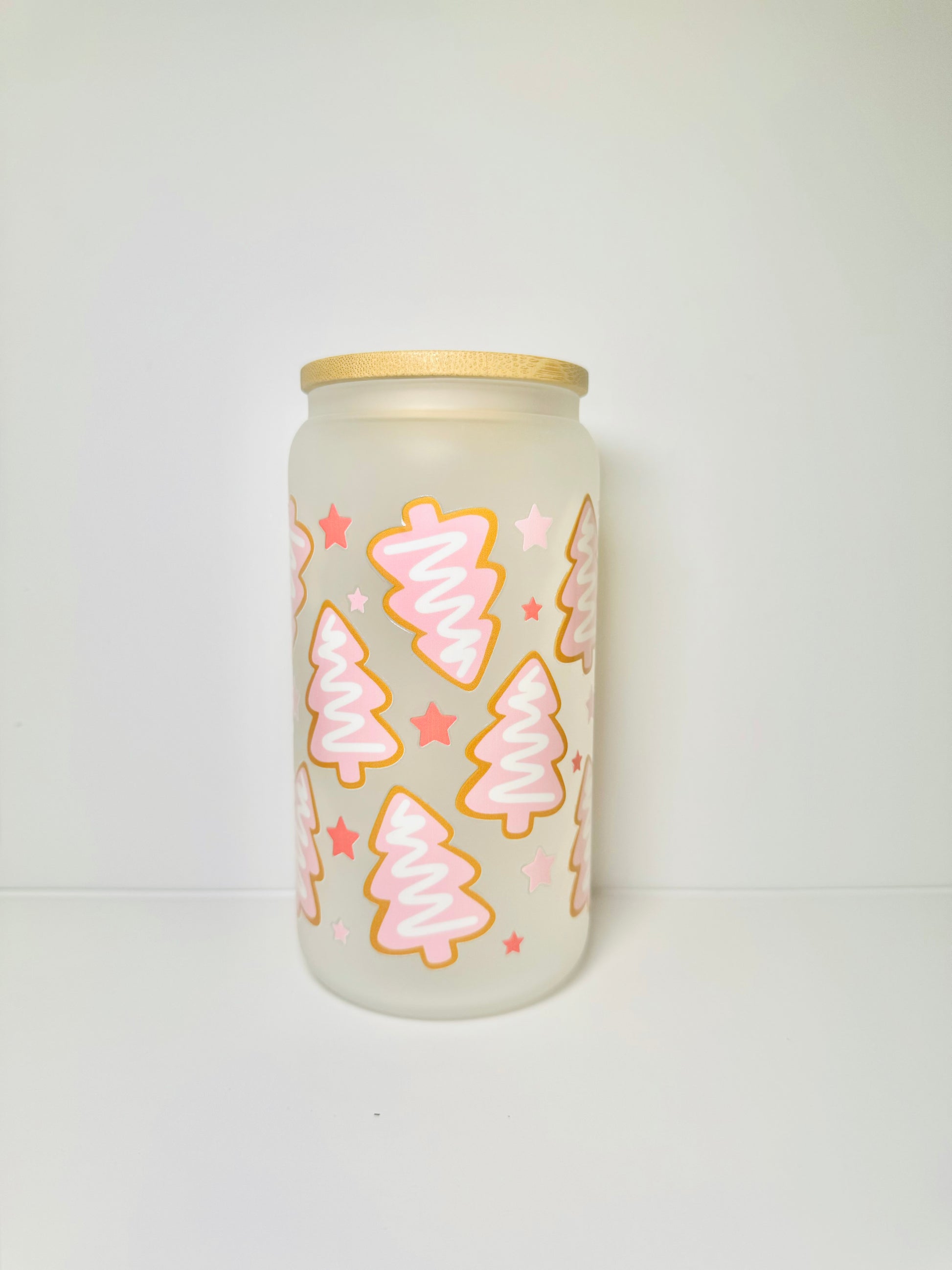 Frosted Pink Trees Christmas 16oz Glass Cup with Vibrant DTF Wrap